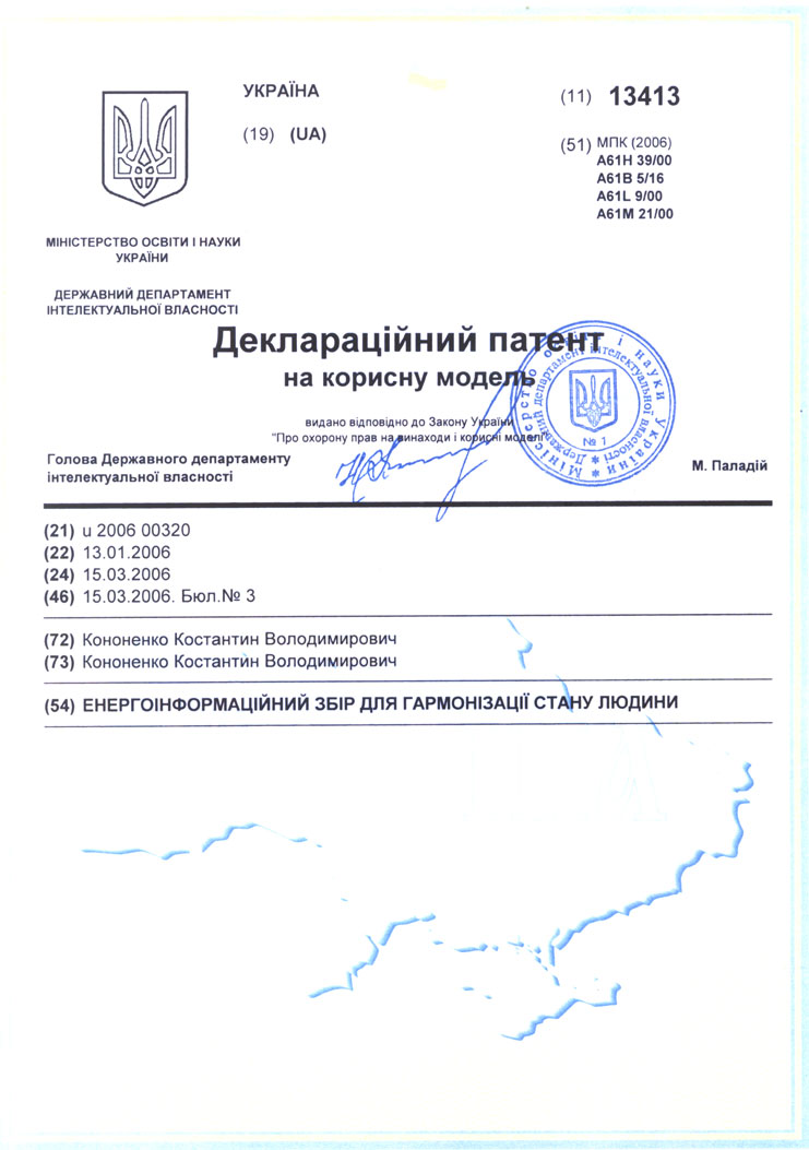 Енергоінформаційний збір для гармонізації психоемоційного, функціонального та фізіологічного стану людини, який містить наступні компоненти: звіробій, деревій, м'яту, піддані енергоінфор-маційній обробці, при цьому як енергоінформаційну матрицю використовують такі природні камені як агат, аквамарин, перли, місячний камінь, обсидіан, опал, рубін, топаз, халцедон. Корисна модель відноситься до медицини та парапсихології і може застосовуватись з метою усунення негативної енергії, покращення самопочуття, усунення негативних впливів навколишнього середовища, боротьби із стресами і можуть використовуватись як вдома так і в громадських місцях, як то в дитячих садках, школах, на підприємствах, в амбулаторних умовах і стаціонарах, медичних закладах. Відомий "Спосіб формування життезабезпечуючого повітряного середовища, що поліпшує умови життєдіяльності біологічних об'єктів та система для його здійснення" [UА №22710А, А61L9/00, публ. "ПВ" № 3, 1998], який полягає у тому, що в окремому приміщенні вирощують рослини, які наповнюють повітря ароматичними речовинами. Таке повітря подають у приміщення, в якому знаходяться пацієнти. Спосіб дозволяє впливати ароматичними речовинами різних рослин на біологічні об'єкти, при цьому повітря пропускають через приміщення, в яких знаходяться різні за ароматичними характеристиками рослини. Однак реалізація цього способу потребує створення складної технічної системи для формування необхідного повітря, і практично недоцільна з економічних міркувань для індивідуального використання. | |