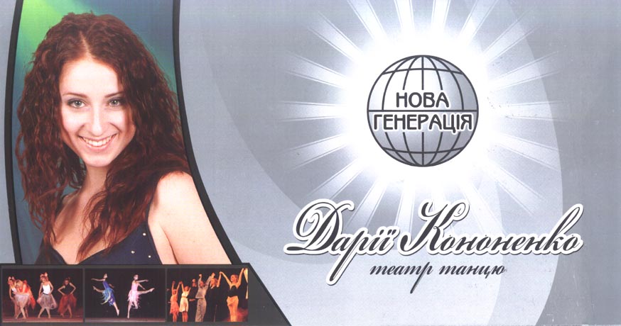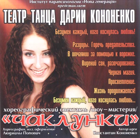 Театр Дарії Кононенко задумано як театр танцю класичної та сучасної хореографії, очолюваний молодим хореографом Дарією Кононенко, де формування репертуару та художні пріоритети визначаються найцікавішими експериментами й сміливою інтерпретацією всесвітньо відомих театральних сюжетів, оновленням і збагаченням форм та лексики сучасного танцю. Створення хореографічного спектаклю (шоу-містерія) "Чаклунки" - велика подія у сучасному мистецькому житті, якою Україна може справді пишатися. У трупі 14 артистів, які є справжніми професіоналами класичного та сучасного танцю (модерн-джаз, сучасна пластика, контактна імпровізація, тощо). Нова концертна програма "Примара щастя" викликає у глядача відчуття руху зсередини. Глядач відчуває і усвідомлює фізичну замученість до подій на сцені. Присутній ефект активної уяви, контакт з почуттями шляхом встановлення зв'язку між емоціями та рухом. Таким чином, глядач сам досліджує себе і відтворюється психічна та фізична гармонія. Концертні програми "Чаклунки", "Примара щастя" і "Білосніжка та семеро гномів" можна подивитися тут | |