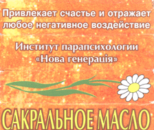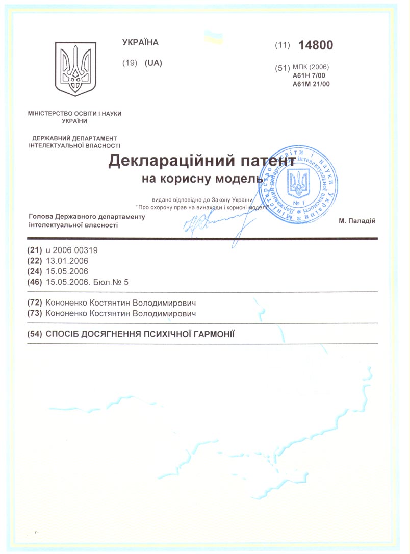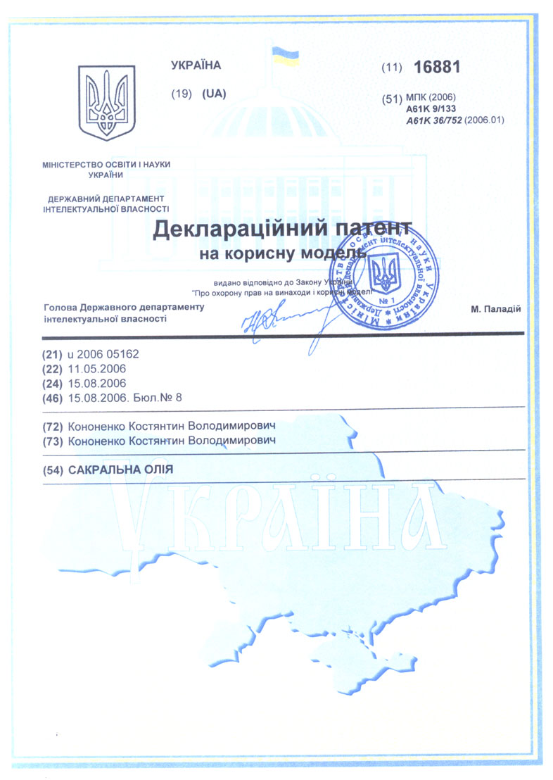 Кожна складова рослина цього збору шляхом фізичної взаємодії каменів та рослини піддається енергоінфррмаційній обробці. При чому кожній рослині відповідають певні камені. Скурювання житла за допомогою даного збору зазвичай робить жінка. У будинку, крім тієї людини хто буде робити цю процедуру, нікого ні повинно бути: ні людей, ні тварин, ні птахів; акваріум накрити щільною темною тканиною. Процедуру варто проводити без електричного світла й інших включених електроприладів. Вміст пакетика висипають в столову ложку або блюдечко і підпалюють верхній шар. З ложкою на протязі 10-15 хвилин потрібно ходити й скурювати приміщення, кімнати, сарай, літні кухні, гаражі, шафи, тумбочки, комори. Попіл або залишок незгорілого енергоінформаційного збору необхідно кинути в проточну воду (умивальник, унітаз) або прикопати в землю. Листівка "Планета" [UA №14800. А61Н7/00, публ. "ПВ" №5, 2006р.], за допомогою якої нормалізується психічна гармонія, виготовлена з крейдованого папера щільністю 100г/м2, розміром А5 (21см х 15см). Листівка є типографською проекцією художньої роботи (полотно, олія), виконаної за замовленням ПП "Нова генерація", надрукованої в журналі "Нова генерація", №1-3, 1993. 30.03. У правому нижньому куті листівки знаходиться текст (колір білий, шрифт Penta Bold, 24 pt) зі збірника віршів А.Д. Дементьева " Виражи времени" - М.: Изд-во Эксмо, 2004.: Не могу уйти из прошлого. Дана листівка має певний набір кольорів у певному співвідношенні, при цьому колір і текст листівки спрямовані на гармонізуючий ефект пацієнта. Лікувальний вплив кольору пов'язаний із впливом коливальних хвиль визначеної довжини на наші органи і психічні центри. На думку багатьох фахівців, механізм багатьох хвороб обумовлений порушенням у тому числі і колірної гармонії, змішанням кольорів, дефіцитом визначеного кольору, необхідного для життєдіяльності органів і психічної гармонії. Якщо повернути відсутність певного кольору або очистити його від сторонніх домішок, можна відновити рівновагу в організмі. Сакральна олія [UA №16881, А61К9/133, публ. "ПВ" №8, 2006р.] містить олію із апельсина та додатково містить чорний кремінь, який додають при гідродистиляції уже готової ефірної олії апельсина. Кремінь в даному випадку слугує інформаційно-енергетичною матрицею, який очищую та активує воду. Способи застосування сакральної олії досить різні: аромаламла, масаж, ванна, лазня, компрес, у шампунь, на мило, білизну, одяг, носову хустку, серветку, подушку, у виді парфумів -методом помірного дотику дозатора (кришка флакона). За допомогою використання сакральної олії досягаються такі результати: