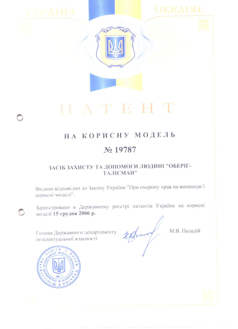 Засіб захисту та допомоги людині "Оберіг-талісман" [UA №19787, A61N2/00, публ. "ПВ" №12, 2006р.] представляє собою картонну двошарову картку розміром 6 х 9см, з однієї сторони якої є зображення Колеса Фортуни з карти Таро №10, а з іншої - зображення Знаку щастя (три рівнобічні трикутники, що між собою сплетені), в середині якої розміщена металева фольга із заліза з вигравіруваним Знаком щастя, яку попередньо було оброблено за допомогою воску та дії енергоінформаційного збору. Засіб, є легким і зручним для постійного носіння, а також може взаємодіяти з будь-якою людиною чи групою людей. Направленість засобу: