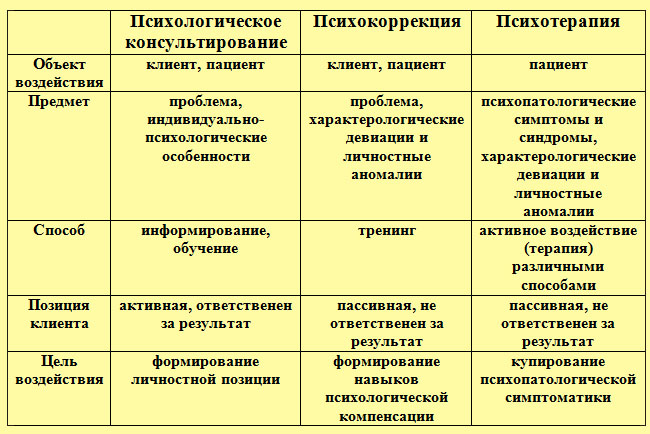 Лишь при наличии совокупности представленных составляющих можно говорить о гармоничности человека в сфере преодоления фрустраций, стрессов и конфликтных психотравмирующих ситуаций и возможности личностного роста. Под психологическим консультированием подразумевается проведение анализа психического состояния клиента или пациента с использованием различных видов психологической диагностики (интервьюирования, экспериментов и пр.) с предоставлением ему объективных данных и научных интерпретаций их результатов, которые должны способствовать разрешению стоящих перед человеком общежитейских проблем, формированию новых представлений о различных подходах к решению психологических проблем, вариантах их предотвращения и методах психологической защиты и компенсации, а также расширению его психологической культуры и личностному росту. Таким образом, консультирование охватывает, во-первых, диагностический процесс и способствует определению нормального или аномального развития человека, наличия или отсутствия психопатологической симптоматики; во-вторых, процесс информирования индивида о структуре его психической деятельности и индивидуально-психологических особенностях, благоприятных и потенциально патогенных жизненных ситуациях; в-третьих, процесс обучения навыкам психологической защиты, аутотренинга и иных способов нормализации собственного эмоционального состояния. Психологическая коррекция базируется на консультировании и предполагает целенаправленное психологическое воздействие на клиента или пациента с целью приведения его психического состояния к норме в случаях диагностики у него каких-либо характерологических девиаций или личностных аномалий, а также для освоения им какой-либо деятельности. Психологическая коррекция в клинической психологии направлена на активное внешнее вмешательство в формирование адекватного и искомого психического состояния человека, его активности и душевного комфорта, гармонизации его отношений с социальным окружением. Психотерапия в узком понимании термина является видом активного психологического воздействия на пациента, имеющего психопатологические симптомы и синдромы и находящегося в состоянии кризиса, фрустрации, стресса или душевной болезни. Психотерапия подразумевает как купирование болезненных клинических проявлений, так и коррекцию индивидуально-психологических свойств человека с целью вторичной профилактики психогенных (невротических, психосоматических) расстройств и заболеваний с помощью специальных способов психотерапевтического воздействия. При широком толковании термина "психотерапия" под данным видом психологического воздействия имеют ввиду все виды направленного психологического воздействия на индивида (консультирование, коррекцию и терапию). Отличия различных видов психологической помощи по таким параметрам как цель, объект, предмет, способ воздействия и позиции пациента (клиента) представлены в таблице: Отличия различных видов психологической помощи